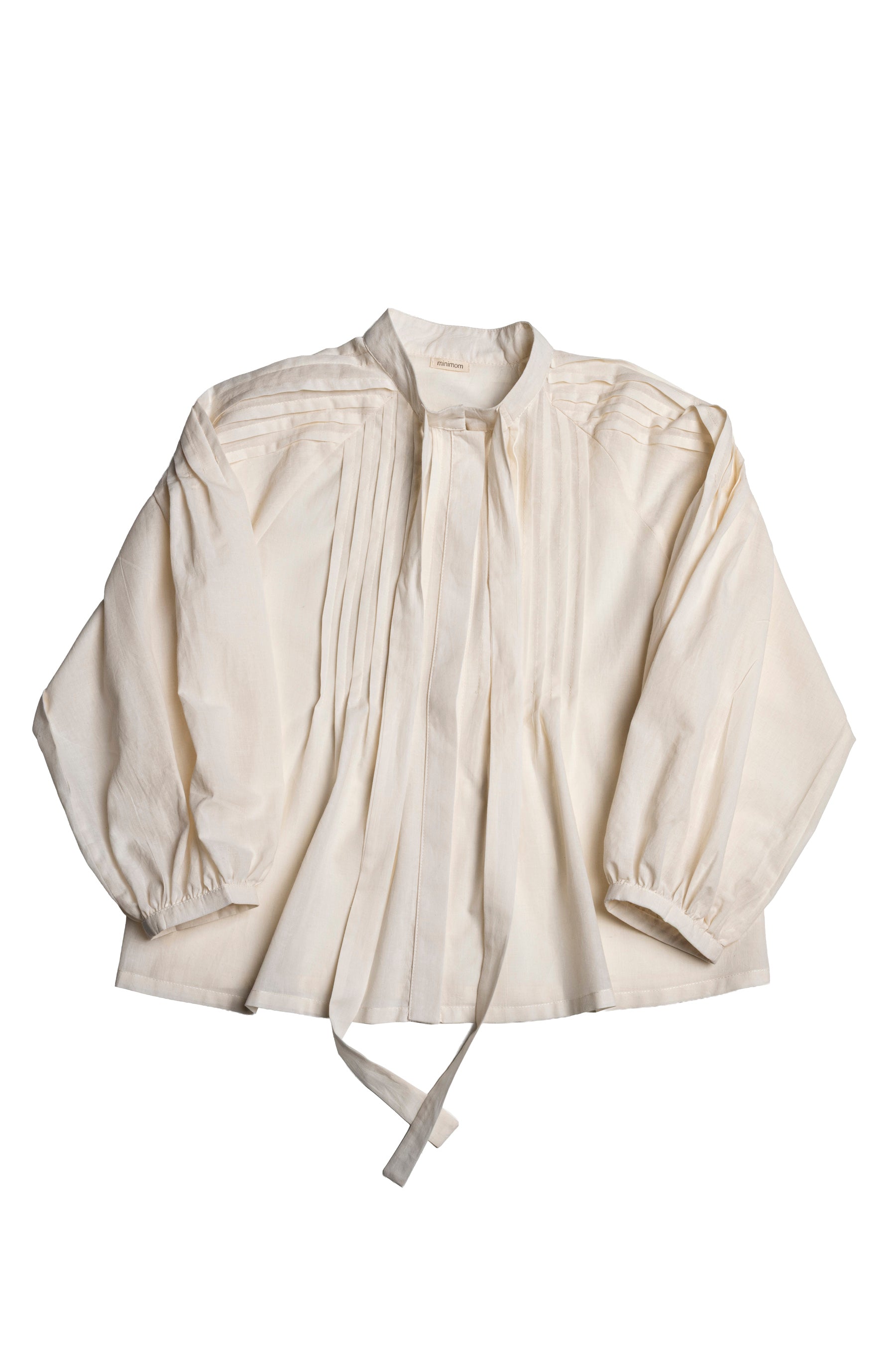 An oversize shirt featuring a round neckline with a bow tie, hidden buttons, and elegant pintuck details on the front and sleeves. A refined and stylish piece for effortless chic.