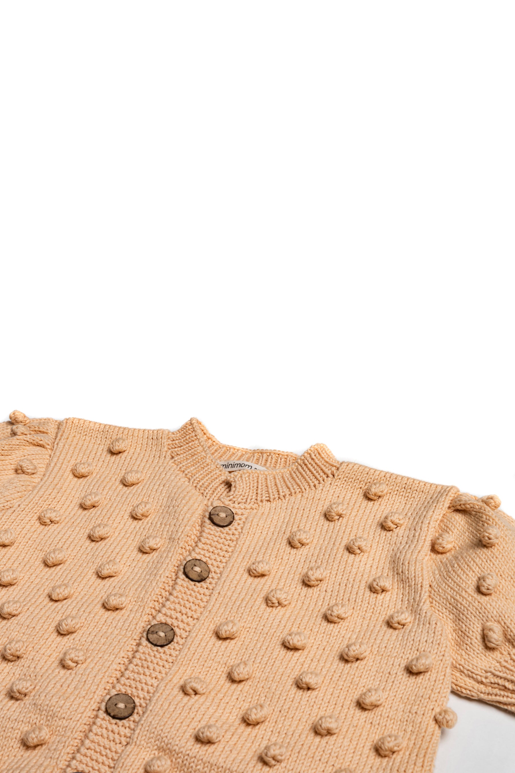 This cardigan is hand knitted from organic cotton. Each garment is different and unique which is a special feature. There is a front closure with natural coconut buttons.